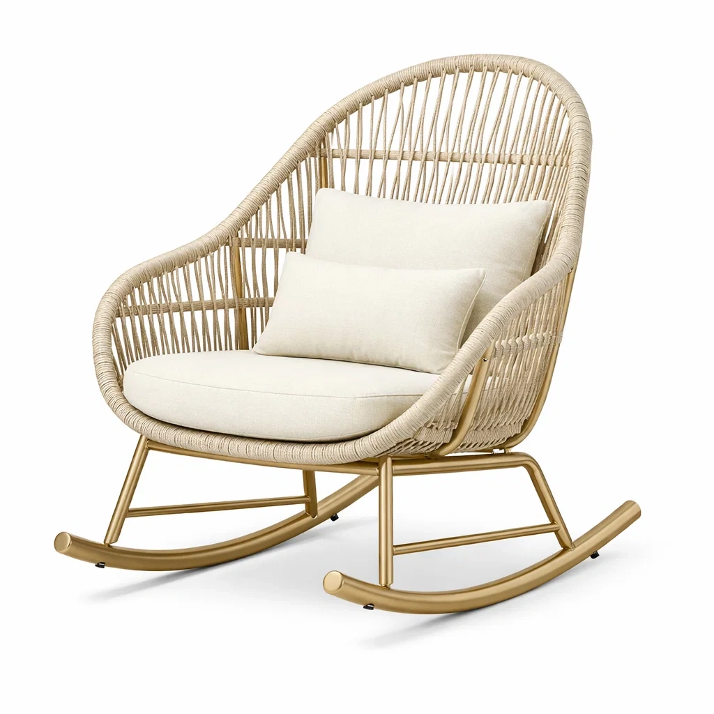 Fauteuil à bascule de terrasse en rotin synthétique et métal avec coussins crème