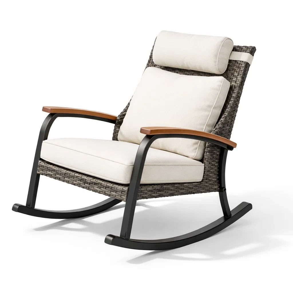 Fauteuil à bascule de terrasse en osier et acier avec accoudoirs en bois