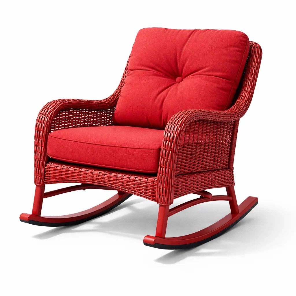 Fauteuil à bascule de terrasse en rotin avec coussins en tissu rouge