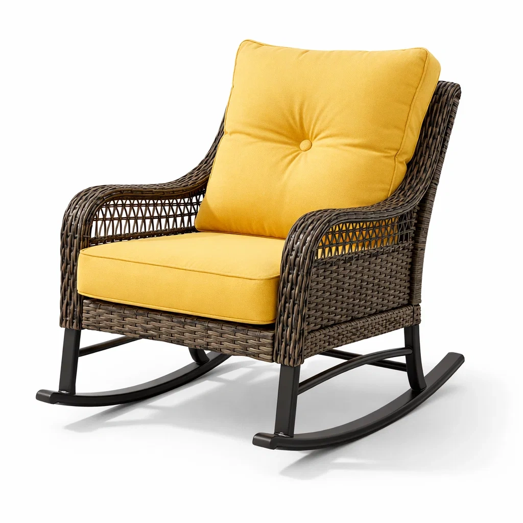 Fauteuil à bascule de terrasse en résine tressée marron avec coussin jaune