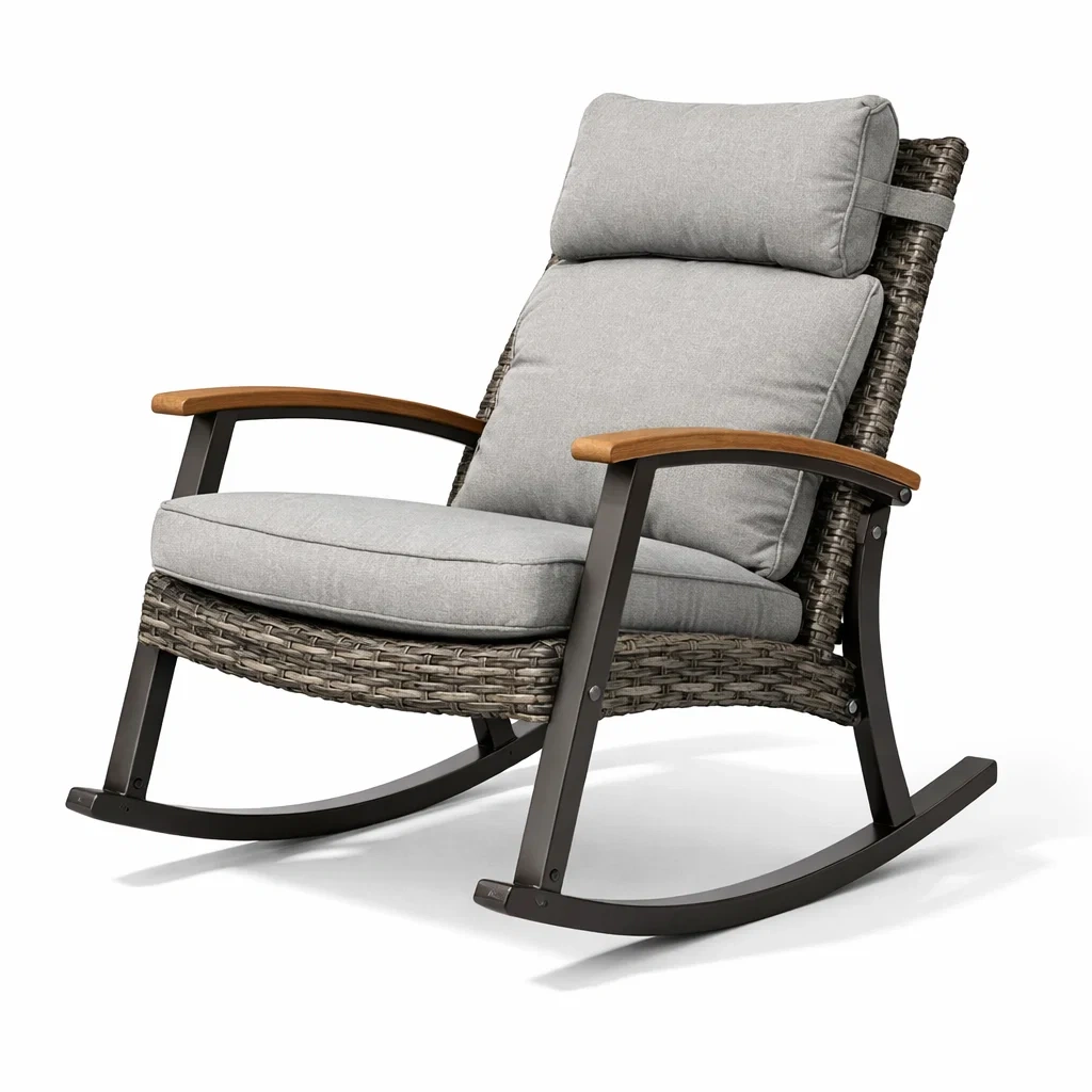 Fauteuil à bascule de terrasse en aluminium et rotin avec accoudoirs en bois