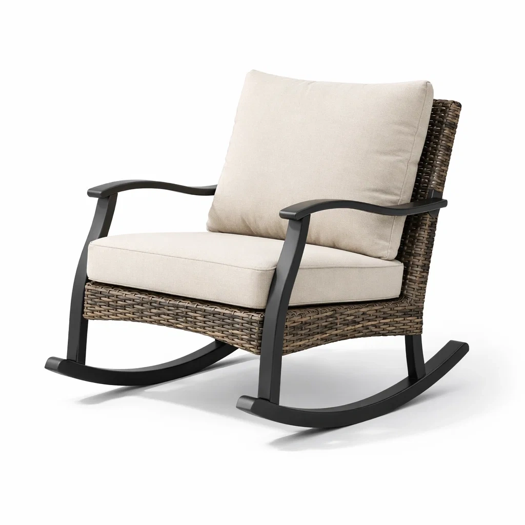 Fauteuil à bascule avec structure en métal noir et rotin synthétique marron.